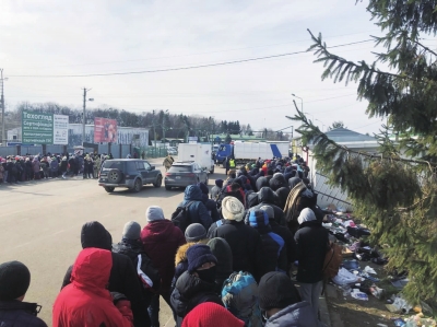 田成发给记者的图片显示,在口岸附近的马路上,道路中间供车辆行驶,马路两边则是排队的群众。田成说,左边是乌克兰公民的排队通道,看上去多是妇女,右边则是外国公民排队通道,各种人群都有。