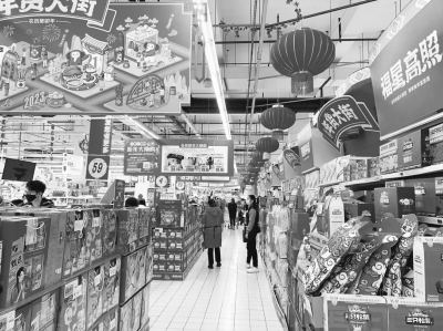 《中国经营报》记者走访成都市多家商超发现,不少商超已提前预热,上架了各类年货商品并推出多种促销活动。在成都一家大润发超市内,各式卡通兔造型的对联、窗花、灯笼等已上架。道路中间摆出糖果、坚果、酒水、零食礼盒等年货产品,组成了一条“年货大街”。